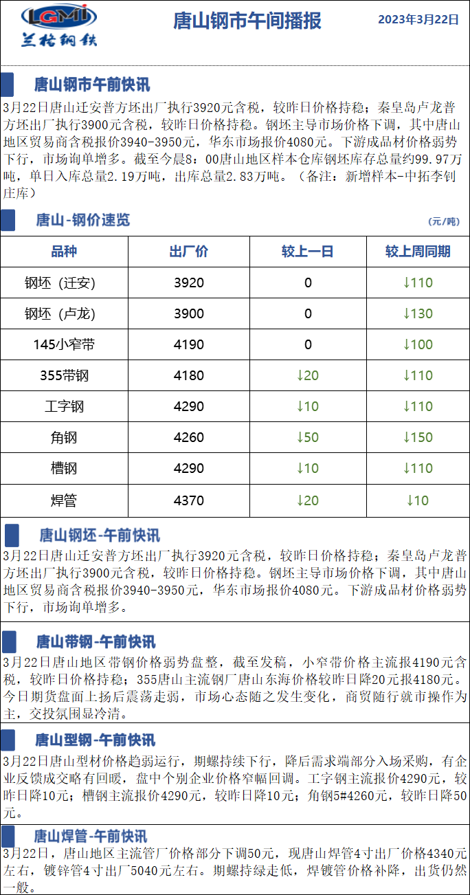 3月22日兰格唐山钢市午间播报