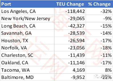 洛杉矶港的进口集装箱下降了41.2%至249,407标准箱,在进口货量中排名第三,仅次于纽约/新泽西港(280,652TEU)和圣佩德罗湾的长滩港(254,970TEU)。与此同时,美东和墨西哥湾沿岸港口的进口量下降18.7%至809,375标准箱。美西继续受到劳工纠纷和进口货运量向美东转移的影响。