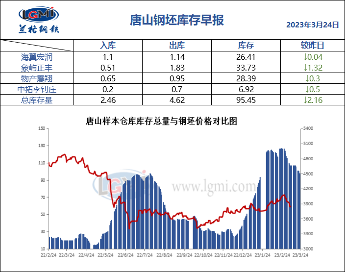 截至今晨8:00唐山地区样本仓库钢坯库存总量约95.45万吨,单日入库总量2.46万吨,出库总量4.62万吨。(备注:新增样本-中拓李钊庄库)