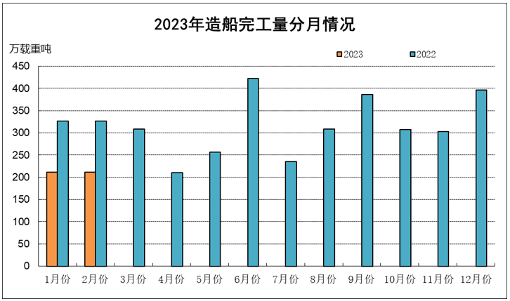1~2月,48家重点监测造船企业造船完工383万载重吨,同比下降40.8%。承接新船订单925万载重吨,同比增长64.1%。2月底,手持船舶订单11057万载重吨,同比增长14.8%。