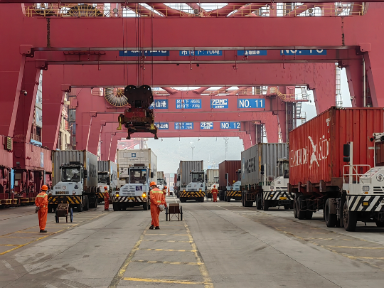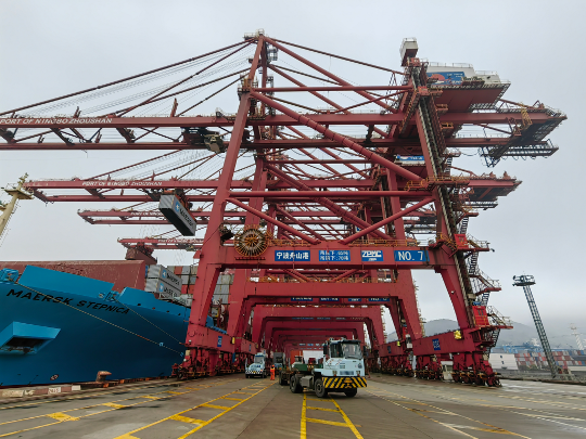 图为3月22日拍摄的宁波舟山港穿山港区集装箱码头,桥吊和集装箱卡车正密切配合装卸货物。新华社记者袁野 摄
