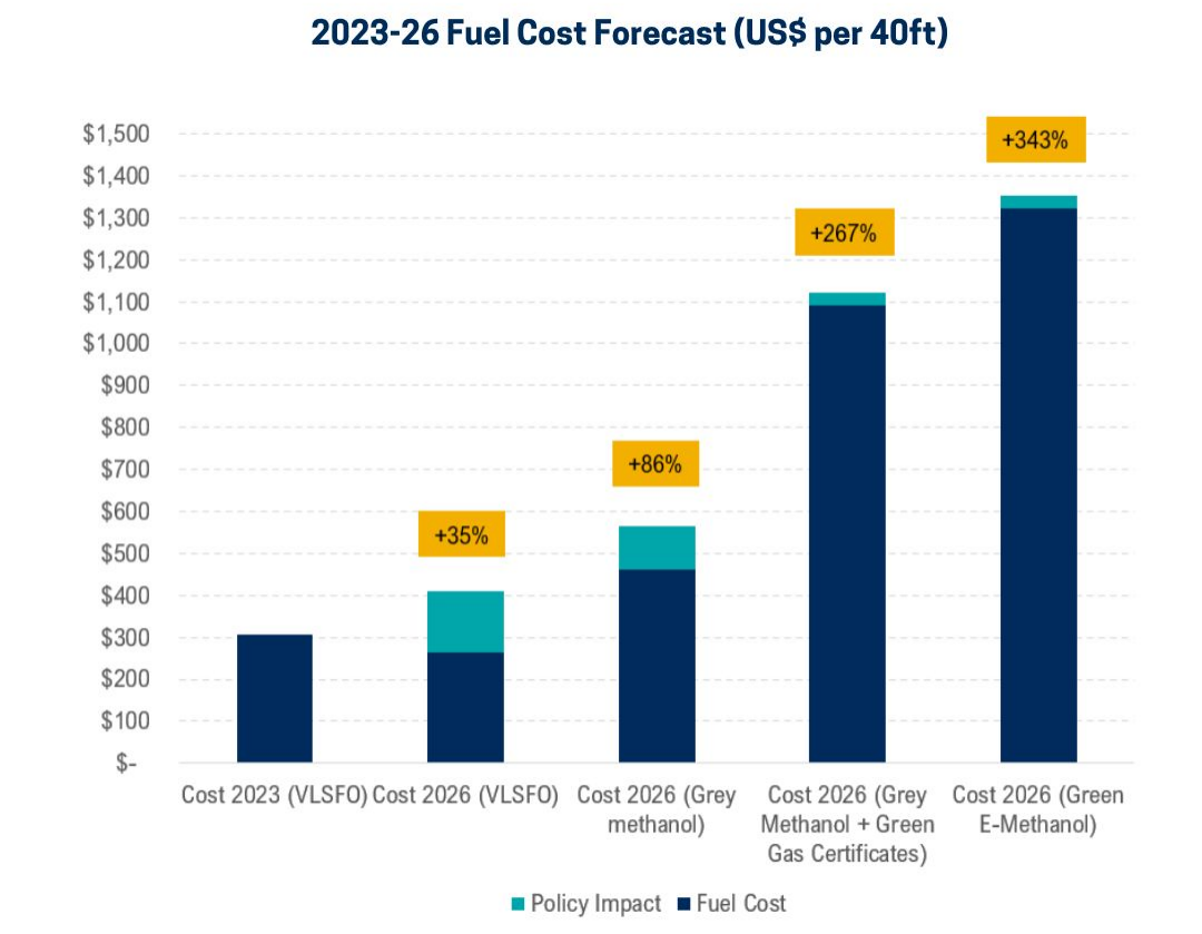 预测结果表明,到2026年,在不改用更环保燃料的前提下,从亚洲到欧洲运输40英尺集装箱的燃料相关碳税成本预计将增加35%;如果采用绿色电制甲醇,预计将使成本增加约340%,这意味着从亚洲到欧洲运输每个40英尺集装箱将额外花费1047美元。其中,对于绿色电制甲醇,预测的价格为1200美元/吨。面对如此巨大的额外成本,如果政府计划通过推广绿色电制甲醇实现绿色航运,或将不得不采取更强有力甚至强制性的法规。