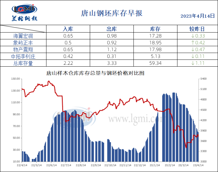截至今晨8:00唐山地区样本仓库钢坯库存总量约59.34万吨,单日入库总量2.22万吨,出库总量3.33万吨。
