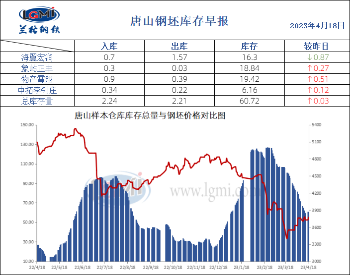截至今晨8:00唐山地区样本仓库钢坯库存总量约60.72万吨,单日入库总量2.24万吨,出库总量2.21万吨。