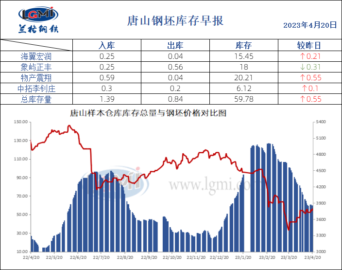 截至今晨8:00唐山地区样本仓库钢坯库存总量约59.78万吨,单日入库总量1.39万吨,出库总量0.84万吨。