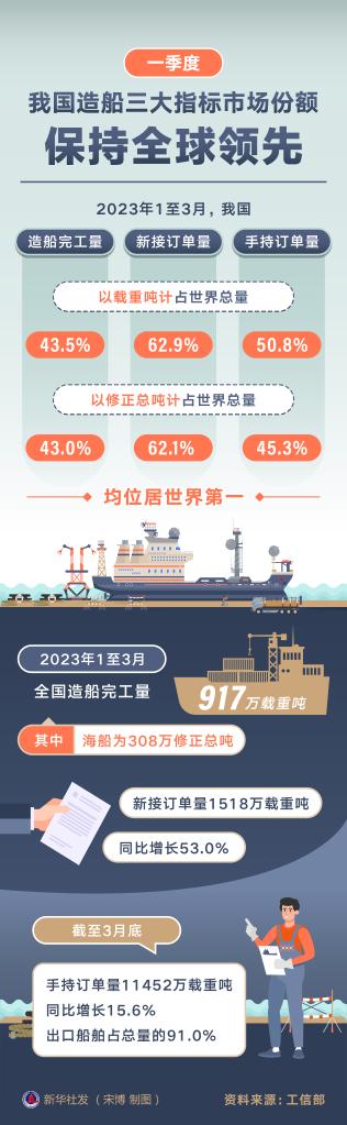 新华社北京4月19日电(记者王聿昊、张辛欣)记者19日从工信部装备工业二司了解到,今年1至3月,我国造船完工量、新接订单量和手持订单量以载重吨计分别占世界总量的43.5%、62.9%和50.8%,以修正总吨计分别占43.0%、62.1%和45.3%,均位居世界第一。