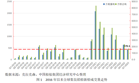 克拉克森数据显示,全球1季度集装箱船新船订单量为434.1万载重吨、170.3万修正总吨。根据经研中心年初对2023年典型船型市场需求的预测,集装箱船2023全年成交量将达到1550万载重吨、660万修正总吨,按序时进度来看,实际成交量略好于当时预期。