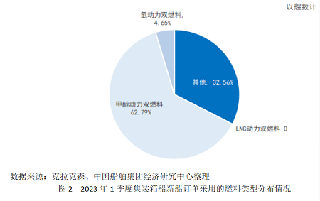 1、从绿色环保角度来看,近年来,在国际海事规则日益趋严的背景下,节能减排成为国际航运业的发展方向之一。传统箱船主要以燃油为动力,碳排放量较大,因而氢、氨、甲醇、液化天然气等绿色环保替代燃料呼声越来越高。根据克拉克森数据,以艘数计,2023年1季度集装箱船新船订单有超过65%采用了甲醇动力、氢动力等替代燃料。