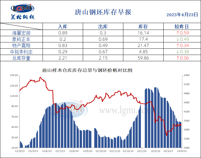 截至今晨8:00唐山地区样本仓库钢坯库存总量约59.86万吨,单日入库总量2.21万吨,出库总量2.15万吨。