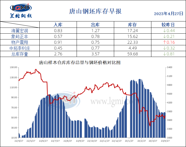 截至今晨8:00唐山地区样本仓库钢坯库存总量约59.68万吨,单日入库总量2.76万吨,出库总量3.57万吨。