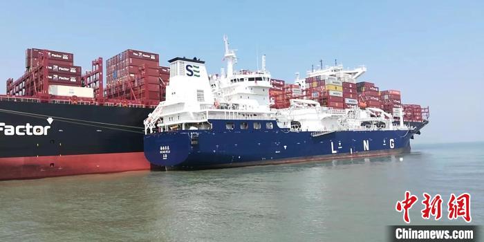 两船成功“牵手”,标志着海上船对船加注保税LNG业务中国首单正式落地。洋山边检站供图