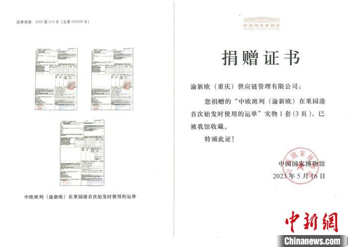 中新网重庆5月17日电 (谢力)记者17日从重庆两江新区获悉,中欧班列(渝新欧)果园港始发时使用的国际随车联运单近日被国家博物馆纳入收藏。