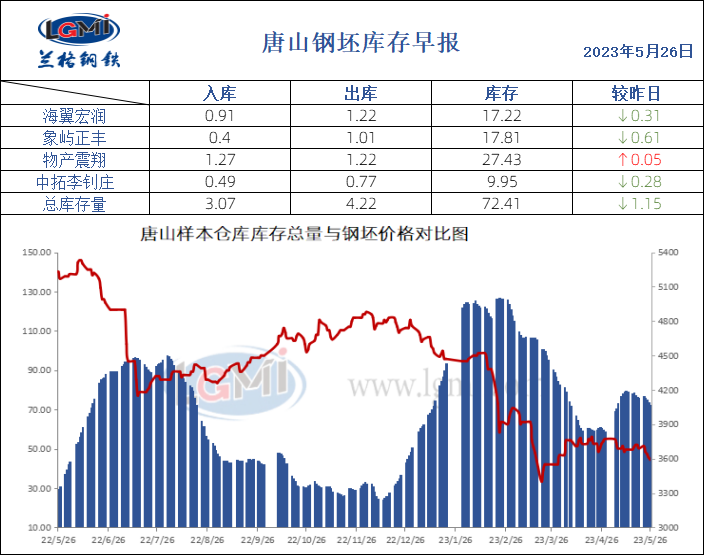 截至今晨8:00唐山地区样本仓库钢坯库存总量约72.41万吨,单日入库总量3.07万吨,出库总量4.22万吨。