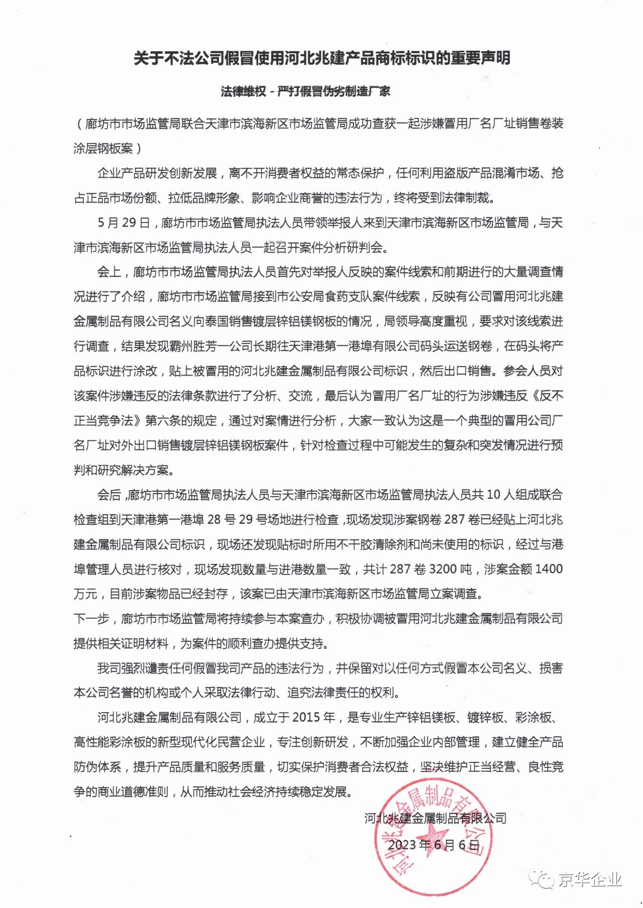 下一步,廊坊市市场监管局将持续参与本案查办,积极协调被冒用河北兆建金属制品有限公司提供相关证明材料,为案件的顺利查办提供支持。