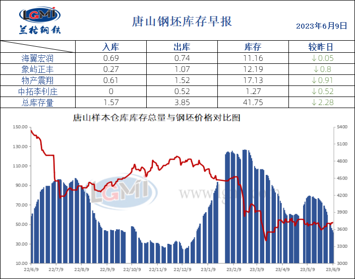 截至今晨8:00唐山地区样本仓库钢坯库存总量约41.75万吨,单日入库总量1.57万吨,出库总量3.85万吨。