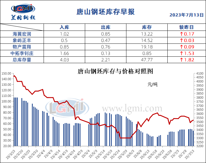 截至今晨8:00唐山地区样本仓库钢坯库存总量约47.77万吨,单日入库总量4.03万吨,出库总量2.21万吨。