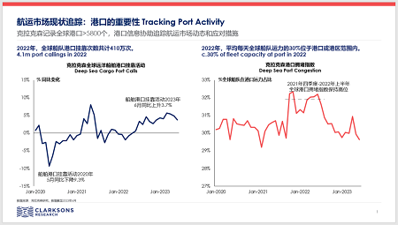 同时,我们又看到此轮周期市场行情中,事件影响导致市场的波动性加剧,如疫情原因导致的供应链影响和贸易格局的变化。在此背景下,港口数据为业内及时、准确的追踪贸易需求和船队运力影响发挥了重要作用。港口的数据应用也很好的体现了港口在供应链中的核心作用。这里我分享一组克拉克森的港口统计数据: