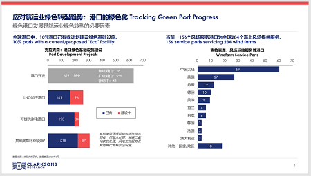 第一点,替代燃料动力船舶和其他技术发展明显加快,克拉克森统计2022年全球新船投资中,对低碳技术船舶的投资已经超过传统燃油船舶的投资。投资者信心也来自港口绿色基础设施的快速发展。我们统计,当前全球范围内提供船舶LNG加注的港口数量为161个,预计到2024年,港口数量将超过250个。中国目前建设完工的船舶LNG加注设施多分布于内河航道,包括岸对船,槽车加注,但目前上海港、宁波舟山港和深圳港已可以为远洋船舶提供LNG船对船加注服务。此外,193个港口可为靠港船舶提供岸电,另有34个在开发中。随着甲醇动力船舶受到关注增加,全球其他替代燃料加注设施的建设也开始发展。