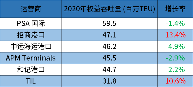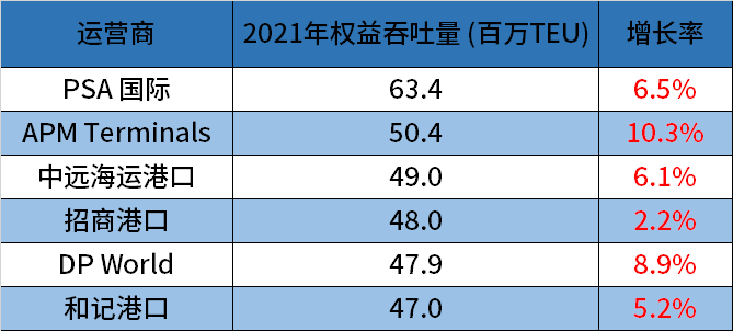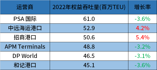 据德路里《全球集装箱码头运营商年度回顾与预测》(2023/24)报告,按权益吞吐量排名,2022年全球前6大集装箱码头运营商分别为PSA国际、中远海运港口、招商港口、APM Terminals、DP World、和记港口。