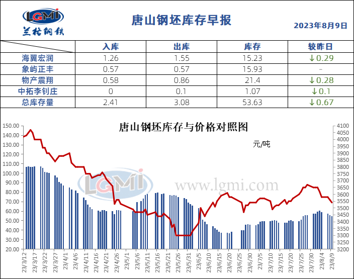 截至今晨8:00唐山地区样本仓库钢坯库存总量约53.63万吨,单日入库总量2.41万吨,出库总量3.08万吨。