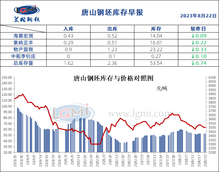 截至今晨8:00唐山地区样本仓库钢坯库存总量约53.54万吨,单日入库总量1.62万吨,出库总量2.63万吨。