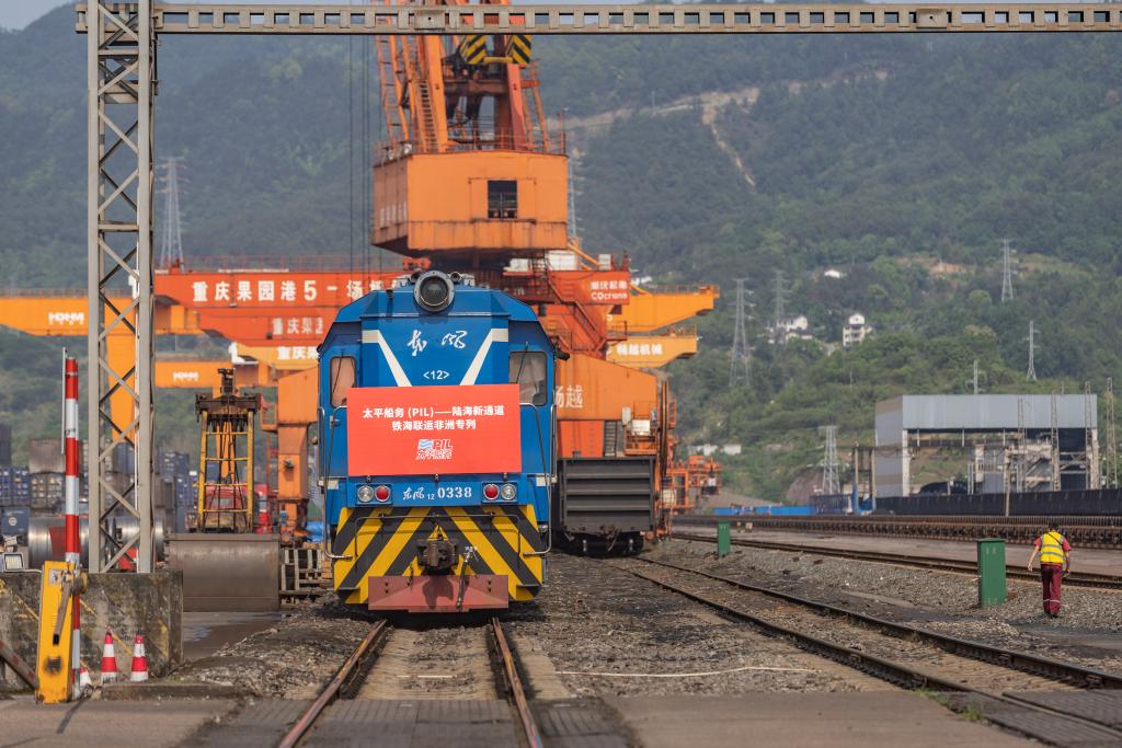 太平船务——西部陆海新通道江铁海联运非洲专列在重庆果园港鱼嘴站等待发车。新华社记者黄伟 摄