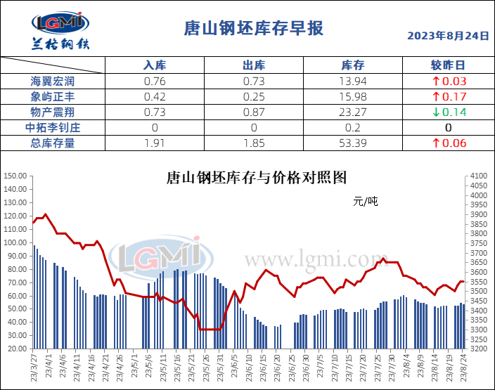 截至今晨8:00唐山地区样本仓库钢坯库存总量约53.39万吨,单日入库总量1.91万吨,出库总量1.85万吨。