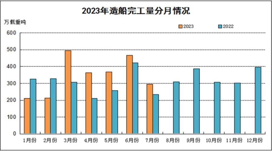 1-7月,我国造船完工量、新接订单量、手持订单量分别占世界市场份额的47.8%、67.7%和52.9%。