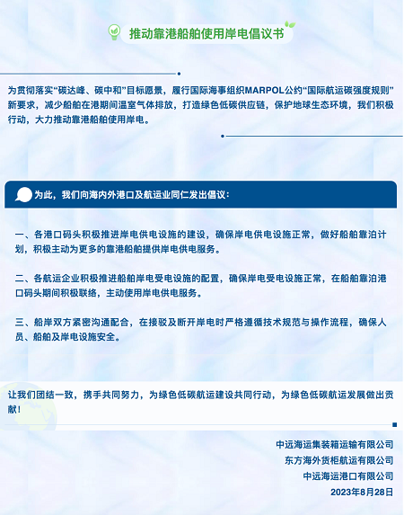 8月28日,中远海运集运、东方海外、中远海运港口,共同发布“推动靠港船舶使用岸电倡议书”。