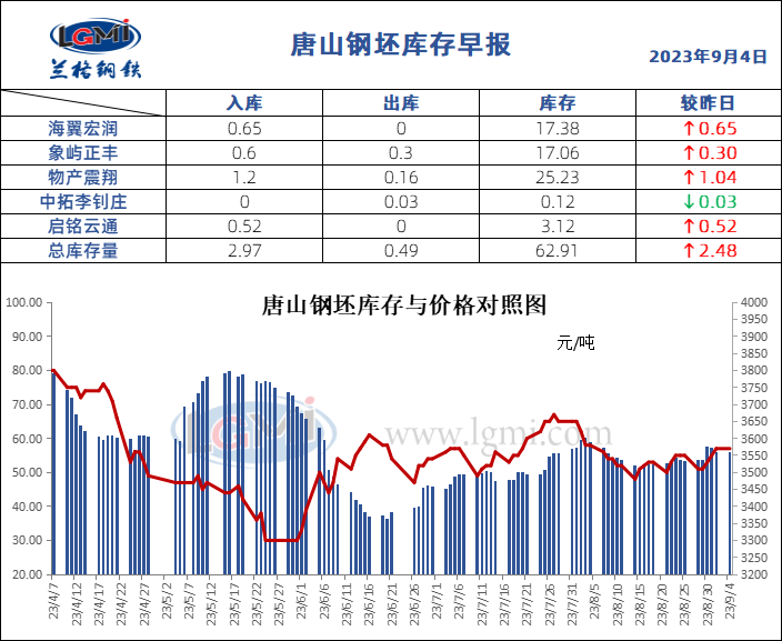 截至今晨8:00唐山地区样本仓库钢坯库存总量约62.91万吨,单日入库总量2.97万吨,出库总量0.49万吨。(新增样本:启铭运通库)