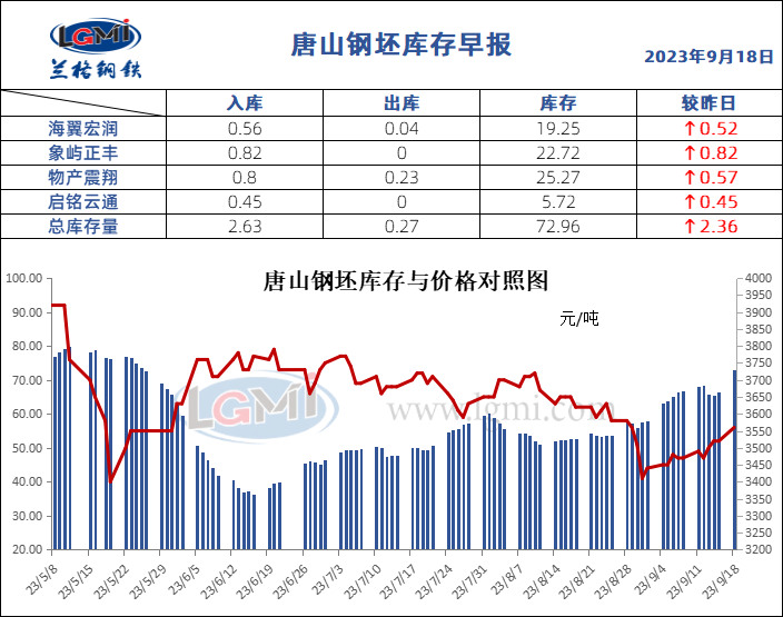 截至今晨8:00唐山地区样本仓库钢坯库存总量约72.96万吨,单日入库总量2.63万吨,出库总量0.27万吨。