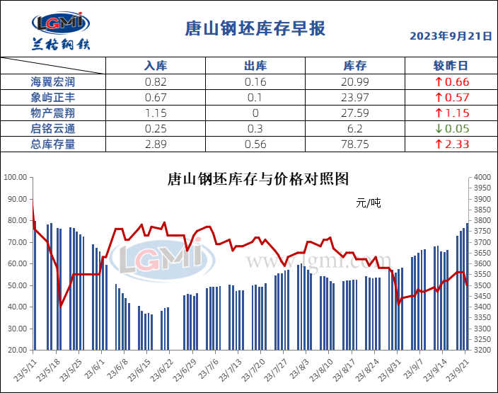 截至今晨8:00唐山地区样本仓库钢坯库存总量约78.75万吨,单日入库总量2.89万吨,出库总量0.56万吨。