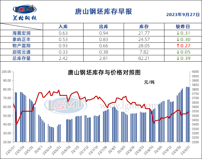 截至今晨8:00唐山地区样本仓库钢坯库存总量约82.21万吨,单日入库总量2.42万吨,出库总量2.81万吨。