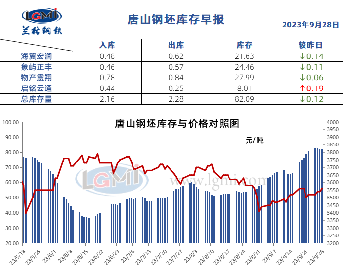 截至今晨8:00唐山地区样本仓库钢坯库存总量约82.09万吨,单日入库总量2.16万吨,出库总量2.28万吨。