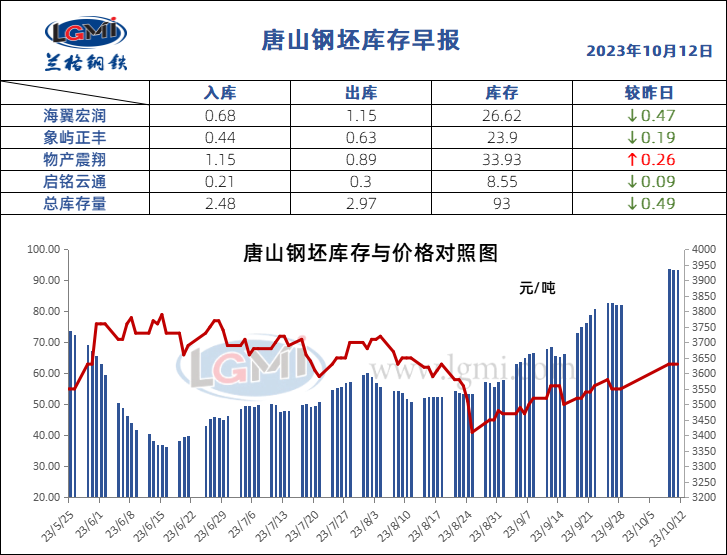 截至今晨8:00唐山地区样本仓库钢坯库存总量约93万吨,单日入库总量2.48万吨,出库总量2.97万吨。