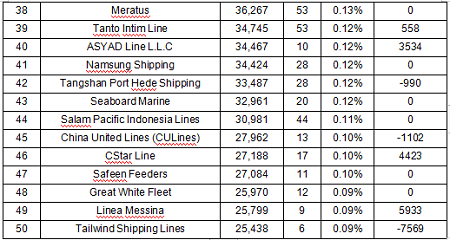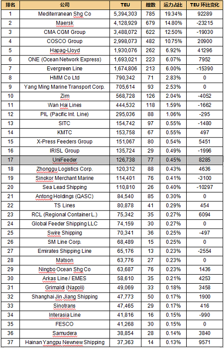 排名第11至20名依次为:万海航运、太平船务、海丰国际、高丽海运(KMTC)、X-Press Feeders Group、伊朗国航(IRISL)、UniFeeder、中谷海运、长锦商船和Sea Lead Shipping。