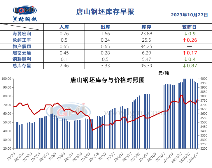 截至今晨8:00唐山地区样本仓库钢坯库存总量约95.39万吨,单日入库总量2.46万吨,出库总量3.33万吨。