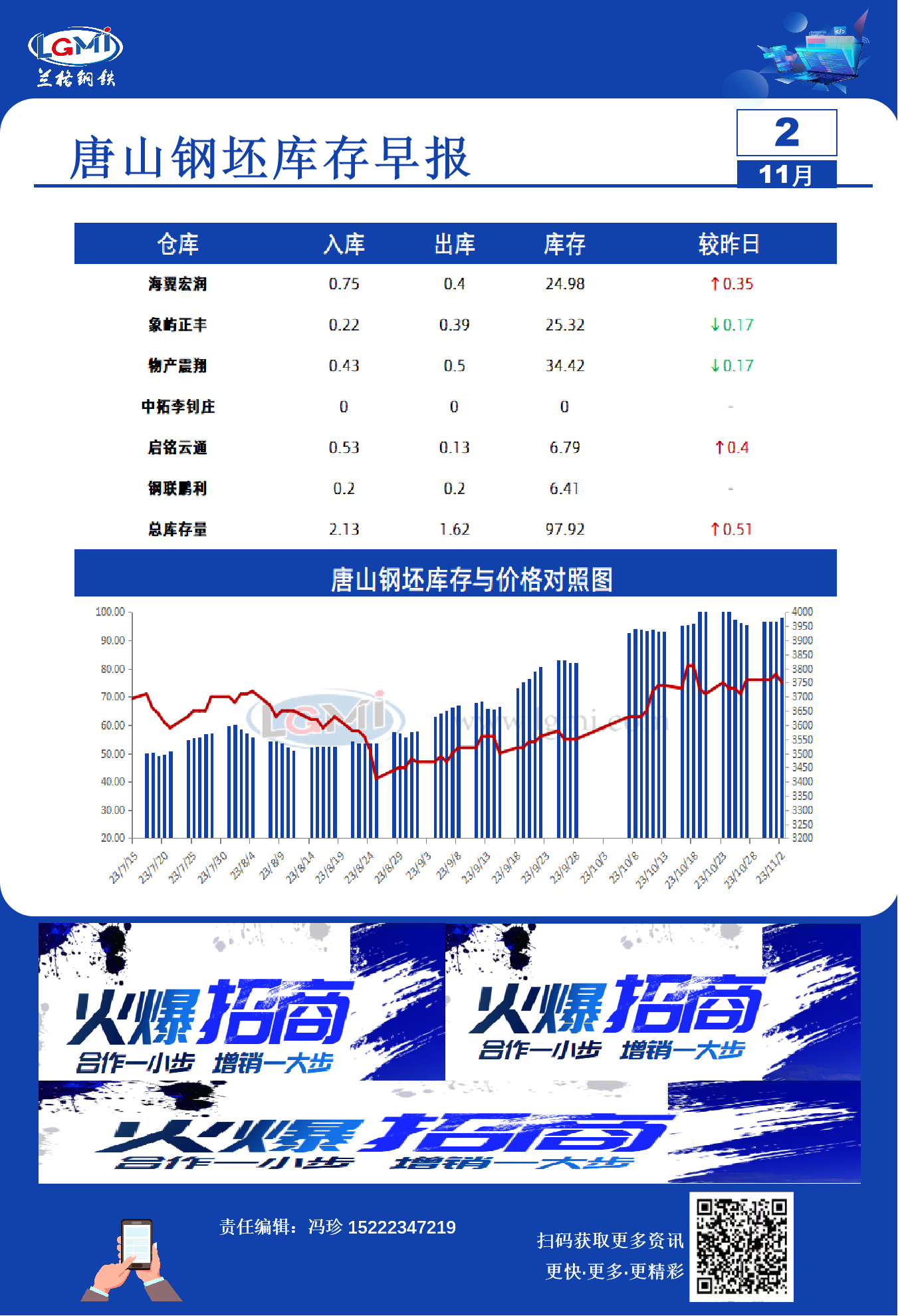 截至今晨8:00唐山地区样本仓库钢坯库存总量约97.92万吨,单日入库总量2.13万吨,出库总量1.62万吨。