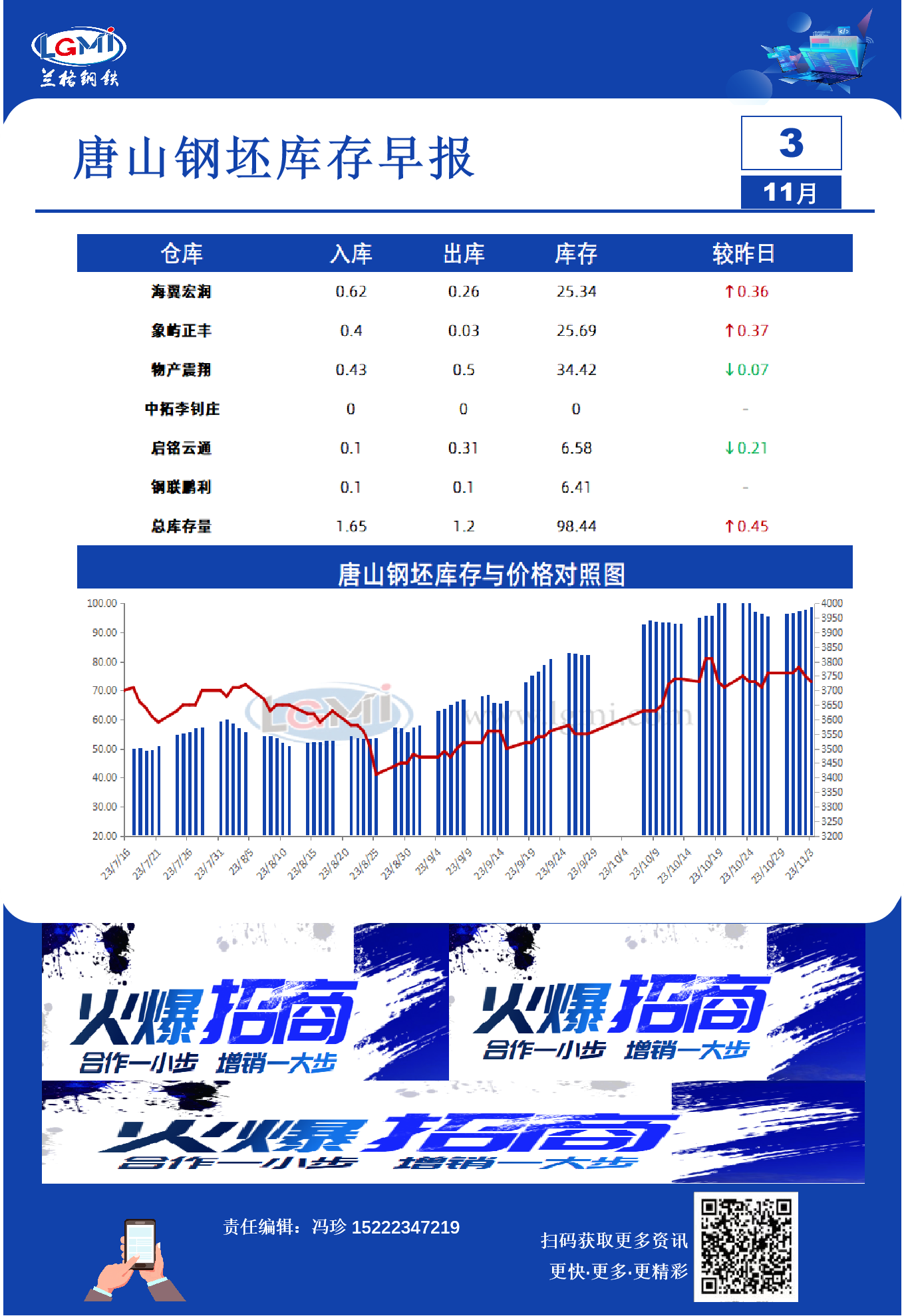 截至今晨8:00唐山地区样本仓库钢坯库存总量约98.44万吨,单日入库总量1.65万吨,出库总量1.2万吨。