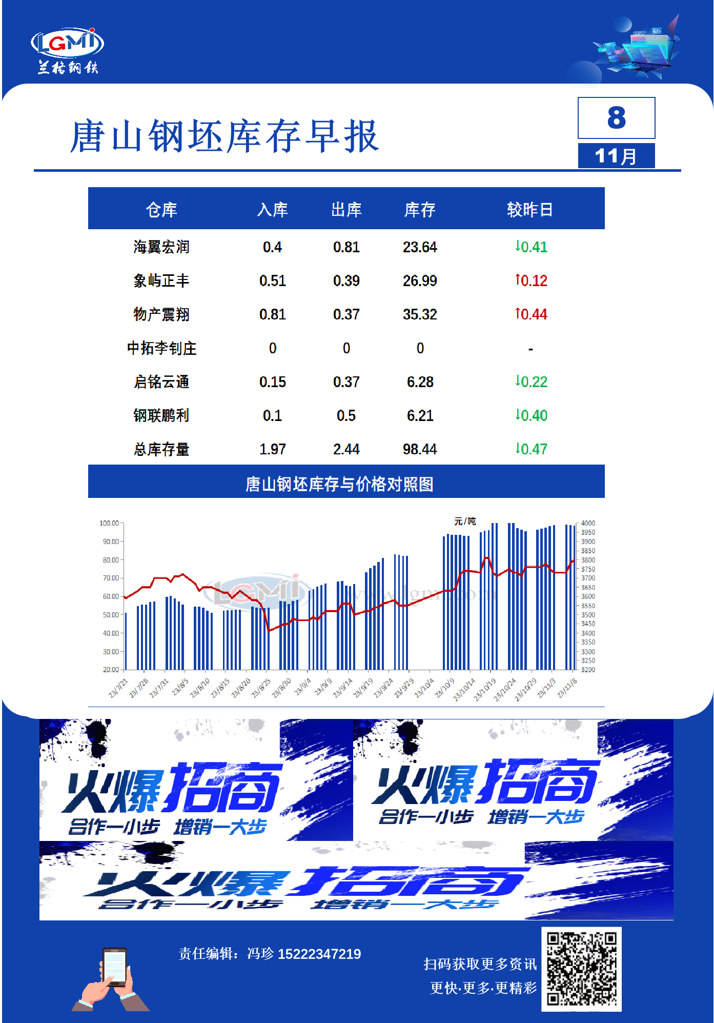截至今晨8:00唐山地区样本仓库钢坯库存总量约98.44万吨,单日入库总量1.97万吨,出库总量2.44万吨。