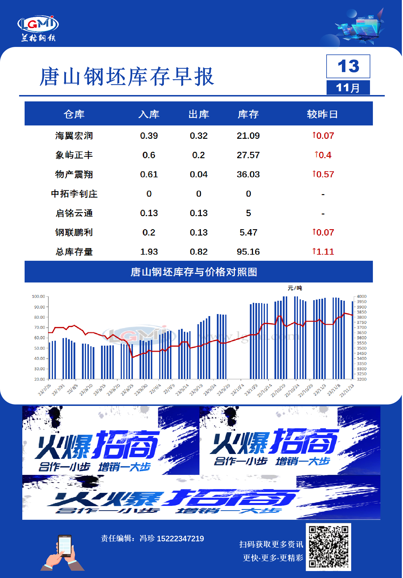 截至今晨8:00唐山地区样本仓库钢坯库存总量约95.16万吨,单日入库总量1.93万吨,出库总量0.82万吨。