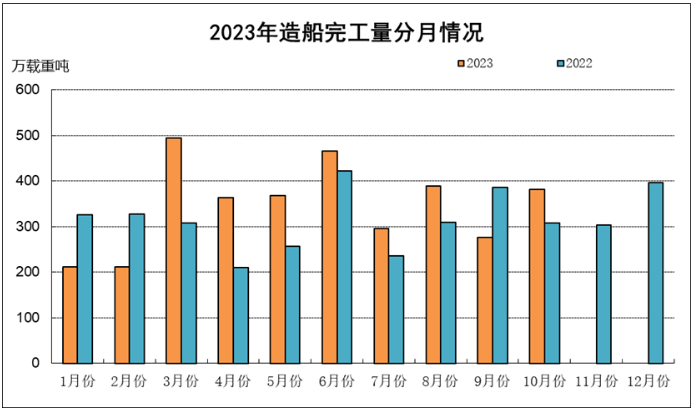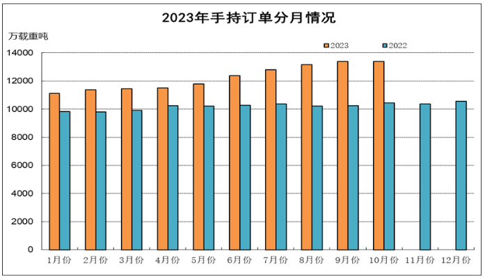 1~10月,全国造船完工量3456万载重吨,同比增长12%;新接订单量6106万载重吨,同比增长63.3%。截至10月底,手持订单量13382万载重吨,同比增长28.1%。