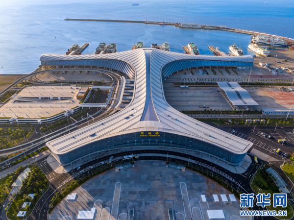 航拍海口新海滚装码头客运综合枢纽站。新华网发