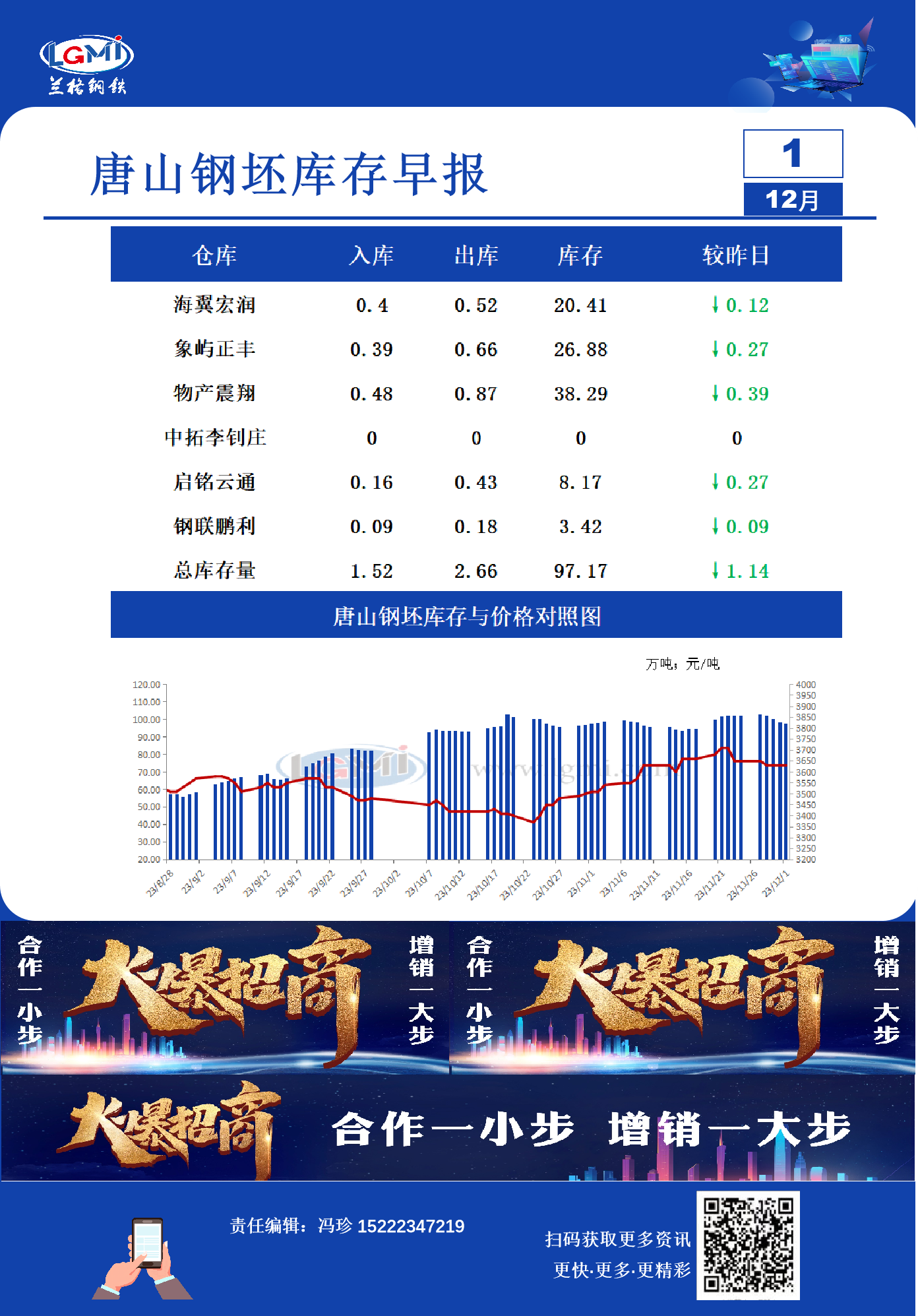截至今晨8:00唐山地区样本仓库钢坯库存总量约97.17万吨,单日入库总量1.52万吨,出库总量2.66万吨。