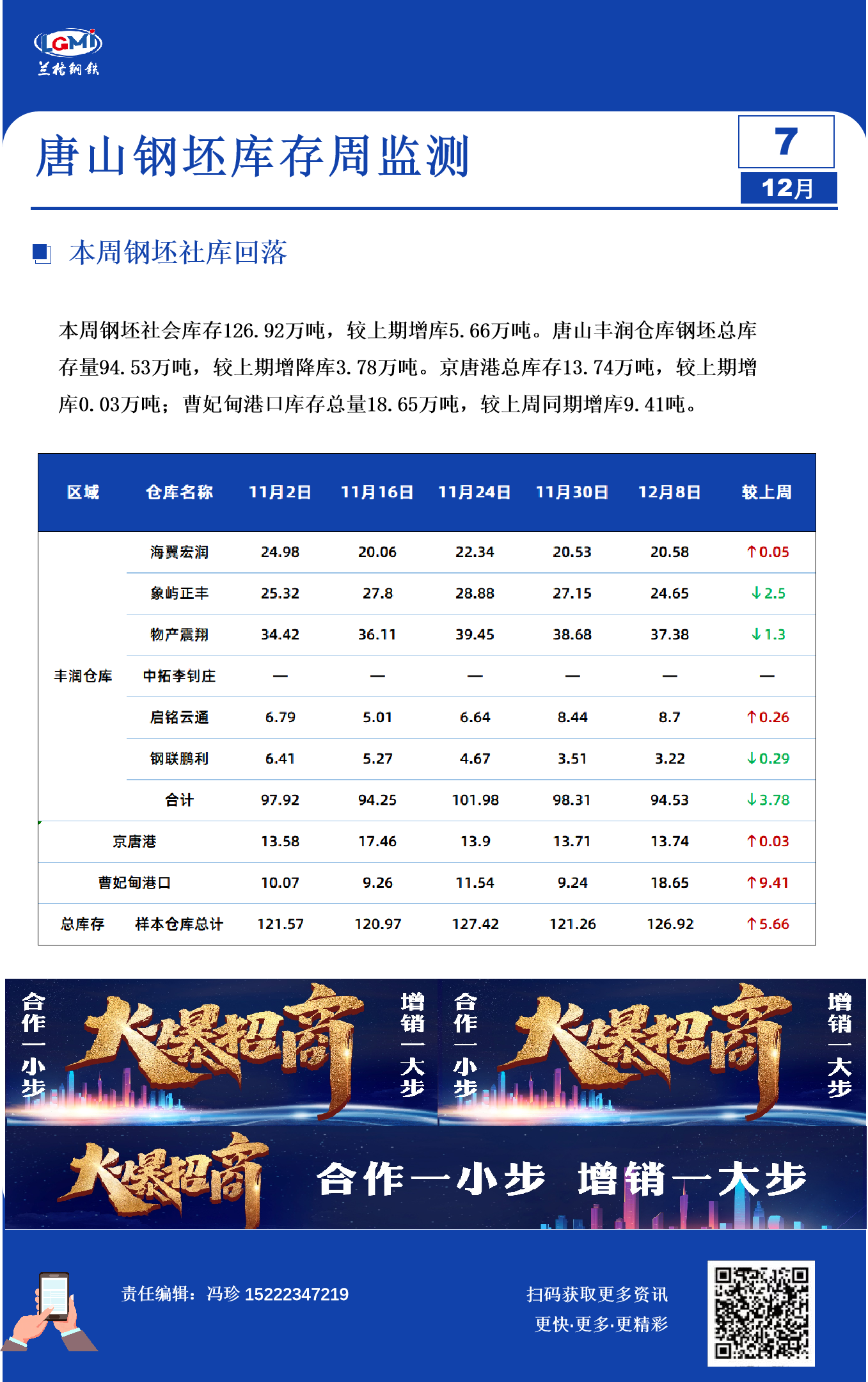 12月7日唐山钢坯库存周统计