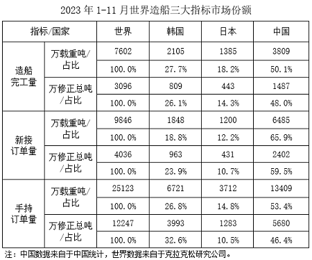 1~11月,我国造船完工量、新接订单量、手持订单量分别占世界市场份额的50.1%、65.9%和53.4%。