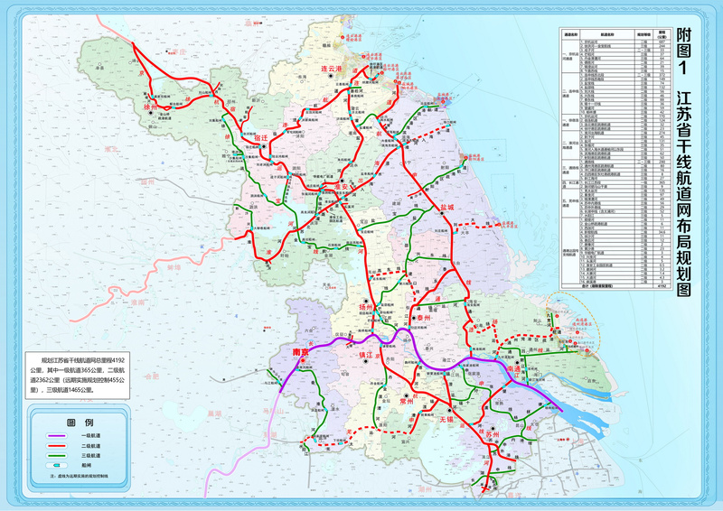 未来,江苏省规划形成“两纵五横”的干线航道网络,“两纵”由京杭运河通道、连申线通道组成,“五横”由徐宿连通道、淮河出海通道、通扬线通道、长江通道、芜申线通道组成,共计4192公里。其中一级航道365公里,二级航道2362公里,三级航道1465公里。二级航道应满足2000吨级船舶正常通行,三级航道应满足1000吨级船舶正常通行。