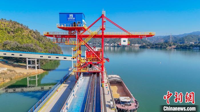 中新网赣州12月26日电 (熊锦阳 尹才霞)12月26日上午,一艘从长三角口岸驶来的装有500吨玉米的货船停靠在泊位上卸货,红色的桥式卸船机用抓斗把一斗斗玉米卸载,再通过专用皮带机廊道输送至散货仓内,这标志着江西赣州首个千吨级货运码头——赣州港五云综合枢纽码头正式开港运营。