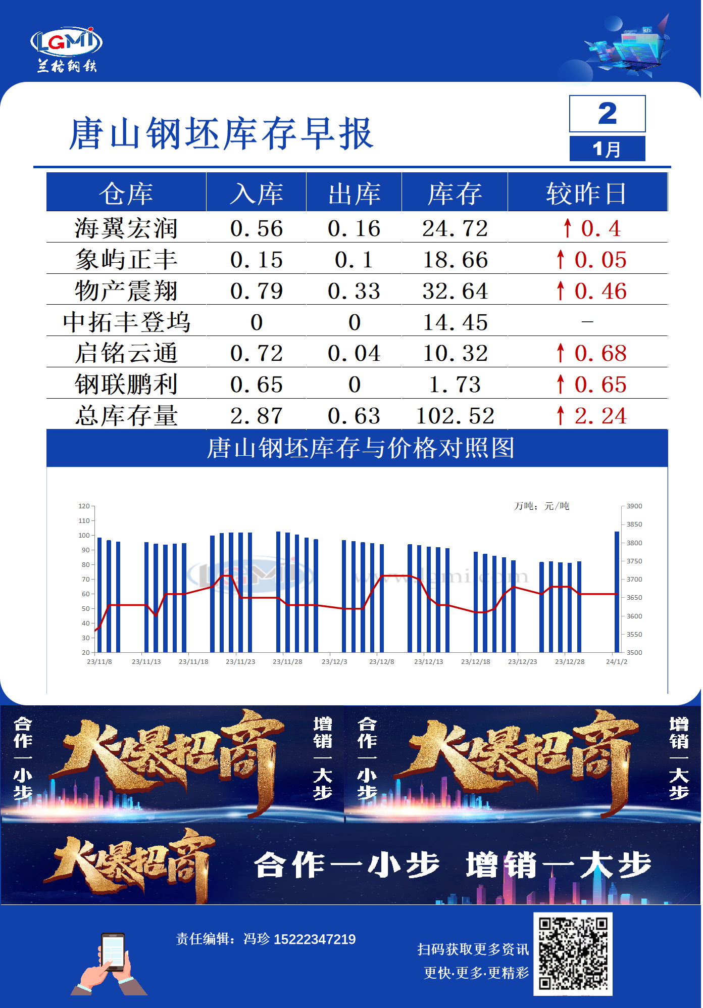 截至今晨8:00唐山地区样本仓库钢坯库存总量约102.52万吨,单日入库总量2.87万吨,出库总量0.63万吨。