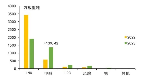 油船和LPG船市场大幅反弹。在经历订单集中释放后,2023年集装箱船、LNG船新单规模出现回落,分别成交1781.9万载重吨、621.7万载重吨,同比分别下滑39.5%、63.3%。相比之下,原油船和成品油船分别成交1515.0万载重吨和1708.9万载重吨,同比分别上涨355.4%和204.9%;LPG船订单共成交503.8万载重吨,同比上涨151.0%;散货船订单规模为4131.5万载重吨,同比上涨16.0%。值得注意的是,2023年替代燃料船舶订单共成交3727.7万载重吨,占比33.7%;其中甲醇燃料船舶订单规模1368.1万载重吨,同比上涨139.4%。